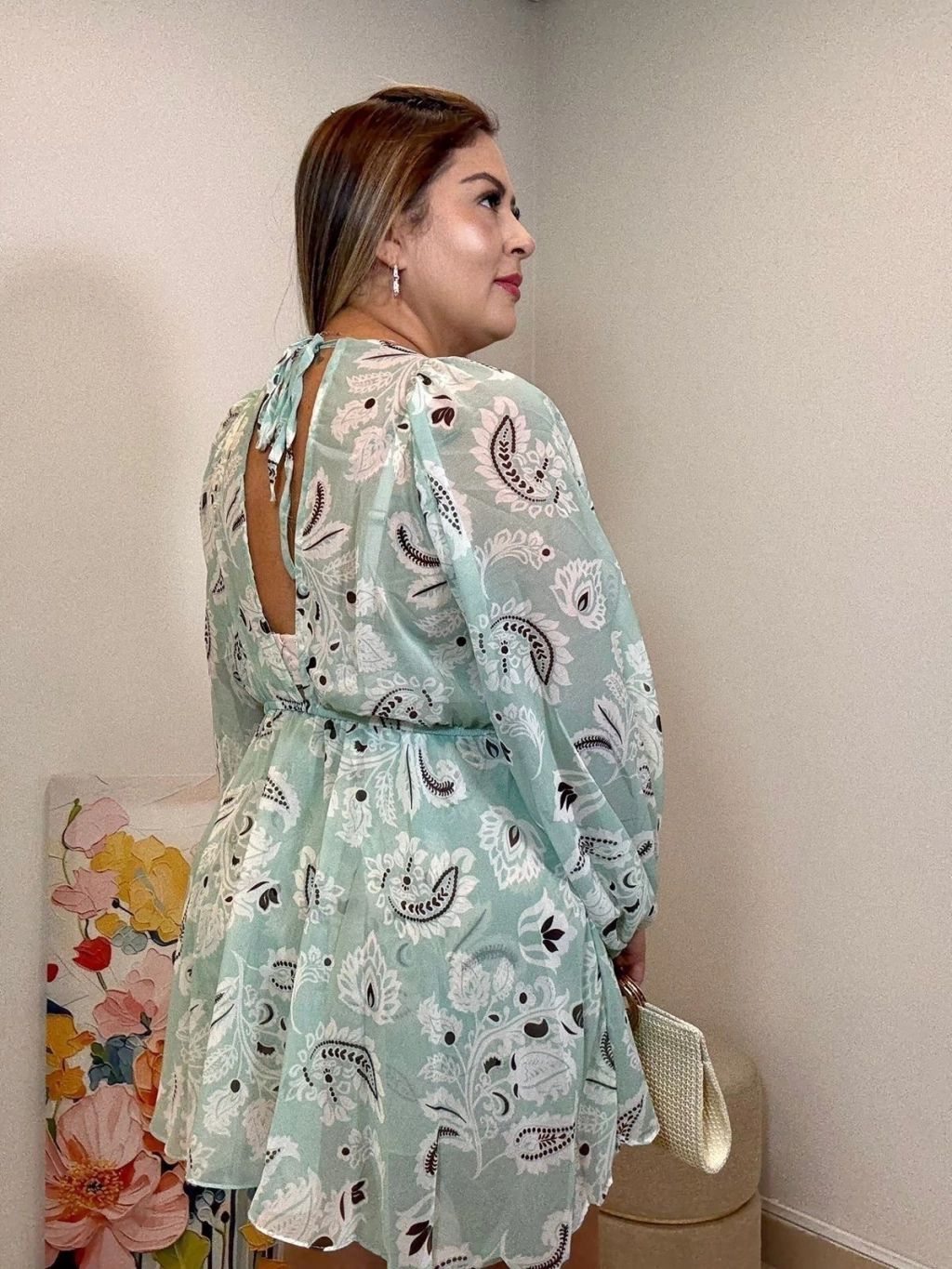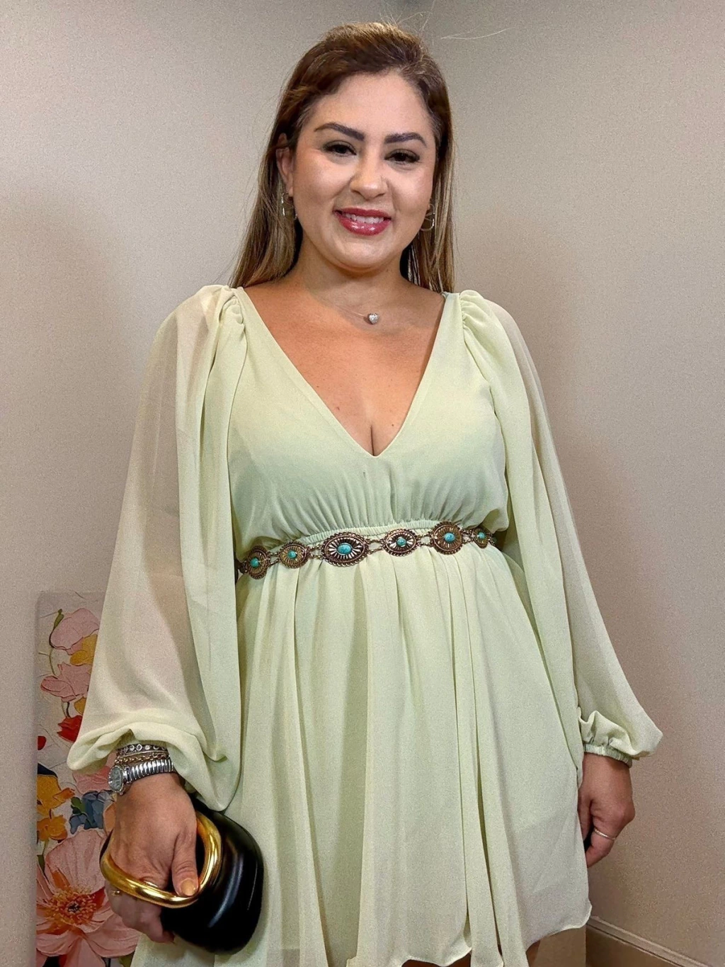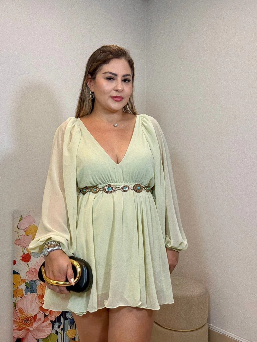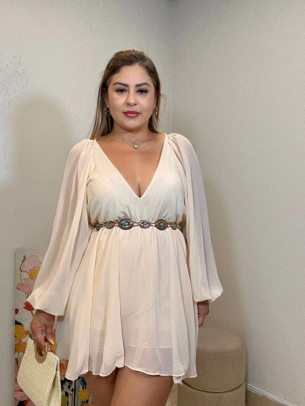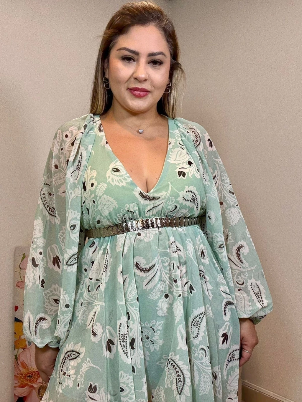 - Mangas compridas fluidas que conferem movimento e leveza.